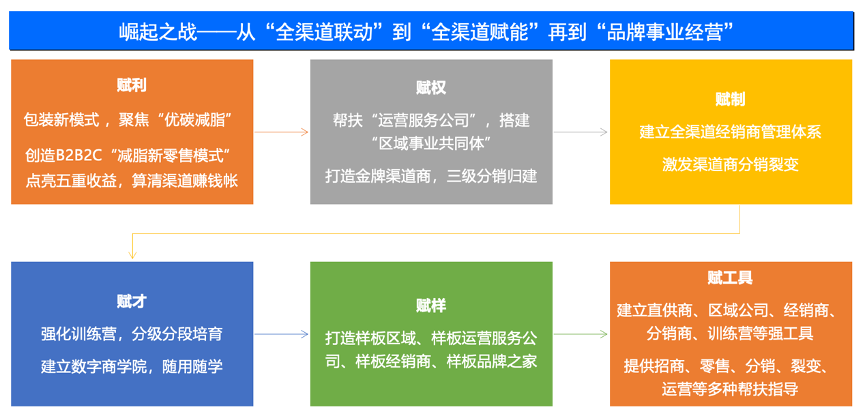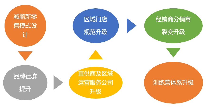 1)樣板區(qū)域打造。選擇設(shè)立“運營服務(wù)公司”、高業(yè)績成交額、高價值認(rèn)同度、高業(yè)務(wù)配合度的區(qū)域;培育金牌直供商,升級現(xiàn)有門店,賦能渠道商拓展分銷,增強“門店減脂消費體驗”。