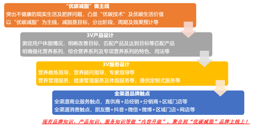 對于“輕天下”,韜慧咨詢認(rèn)為,其“全渠道經(jīng)營提升”其要點在于持續(xù)創(chuàng)造“賦能”,以“優(yōu)碳減脂”做主線,點亮“優(yōu)碳生活”;以3V健康管理主張,搭建集合式產(chǎn)品及服務(wù);更打通商業(yè)伙伴、朋友圈、抖音等全渠道觸點,讓全渠道賦能可落地 & 可執(zhí)行。