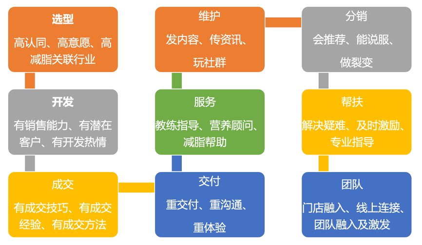 專業(yè)渠道團(tuán)隊打造,從“渠道伙伴選型”入手,選擇對品牌高認(rèn)同、高意愿、高減脂關(guān)聯(lián)行業(yè)的優(yōu)秀伙伴;同時強化其分銷拓展及銷售能力,保持足夠的開發(fā)熱情;有較強的成交能力,可以快速的交付減脂商品,提供優(yōu)質(zhì)的減脂服務(wù)。更重要的是,積極維護(hù)“減脂社群”,推動代理商分銷,積極幫扶指導(dǎo),全力創(chuàng)造團(tuán)隊新價值,連接線上線下。