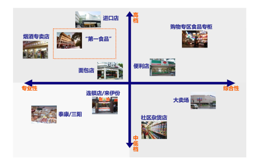 “老字號競爭優勢”之二:檔次及專業性優勢。站在食品產業競爭的角度來進行洞察,我們發現,從經營商品檔次和經營商品表現來看,我們發現在食品產業競爭中,“第一食品”在食品經營專業性和經營高檔商品上占據優勢地位,圍繞食品的多種商品經營和中高檔的商品定位,使其在行業競爭中獨樹一幟。