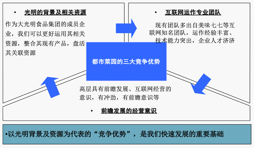 都市菜園隸屬“大光明食品集團”,可以嫁接光明集團的優質資源,尤其是光明集團下屬零售門店資源,這已經成為合作雙方的共識;如何在集團統一戰略下強化用戶經營,突出都市菜園的品牌價值與模式創新,是我們在項目策劃中需要解決的關鍵問題之一。