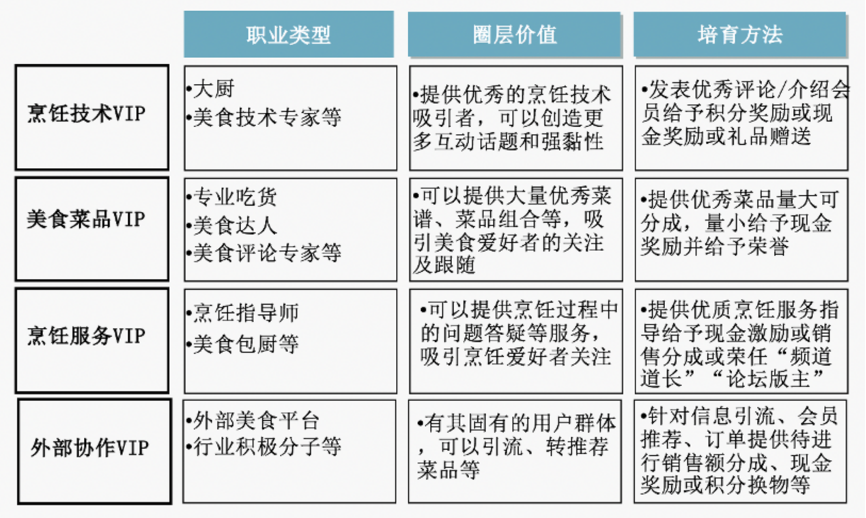 “會員圈層打造四法”之一:從培育會員VIP客戶,強化美食達人、專家/大廚、積極分子等作用,主攻四類VIP,發揮其圈層影響力。