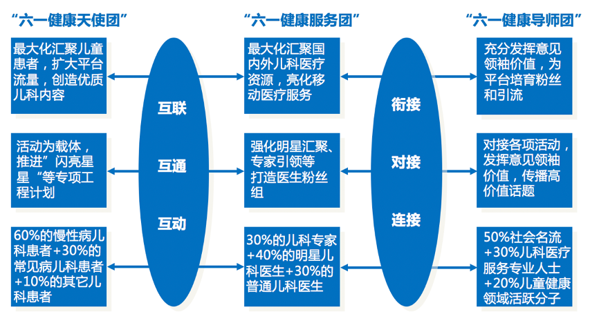 “三大頂級醫(yī)療服務團”打造之“六一健康天使團”:最大化匯聚兒童醫(yī)療專家,擴大平臺流量,創(chuàng)造優(yōu)質兒科內容;活動為載體,推進“閃亮星星”等專項工程計劃;由“60%的慢性病兒科專家+30%的常見病兒科專家+10%的其它兒科專家”組成。
