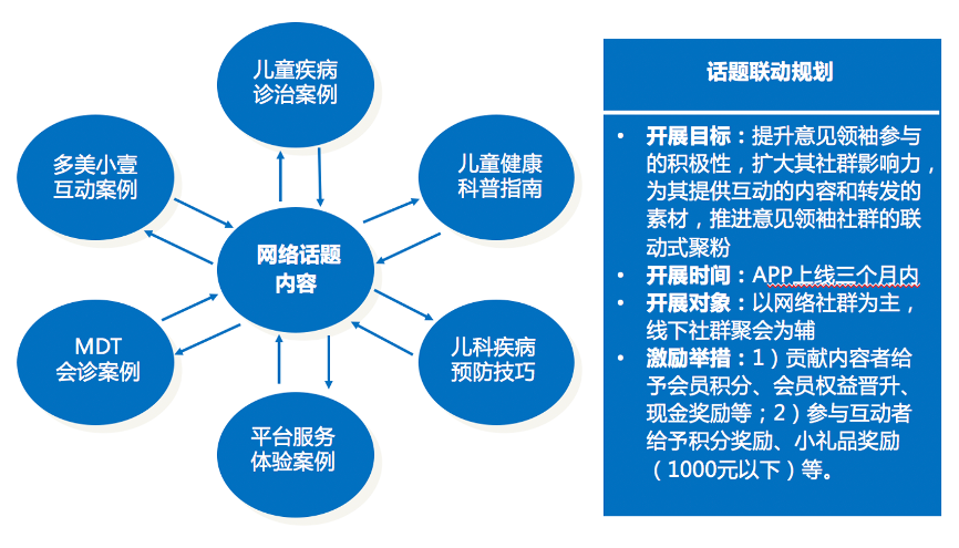 第二步:聚合集粉。通過“網(wǎng)絡話題互動”活動提升意見領袖的參與度,以大量的兒科醫(yī)學內容、兒童疾病診治案例、兒童健康科普指南、兒科疾病預防技巧、平臺服務體驗案例等強化患者聯(lián)動,并以老帶新,實現(xiàn)患者快速集聚。