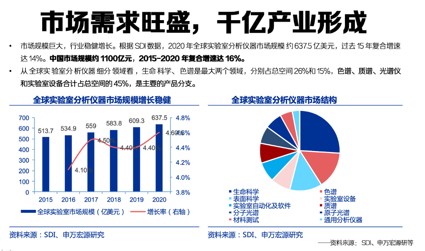 市場需求旺盛,千億產業形成。從 全球實 驗室分 析儀器 細分 領域看 ,生命 科學、 色譜是最大兩個領域,分別占總空間 26%和 15%,色譜、質譜、光譜儀和實驗室設備合計占總空間的 45%,是主要的產品分支。