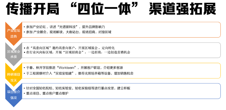 3)科研項目公關。“光照培養箱”主要針對的是高校用戶,其春秋開學之際正是“銷售高峰”之時,通過“workteam”來開展客戶聯誼及拓展意向客戶,通過之前的線索植入“實驗室組建”,以此獲得更多銷售機會。