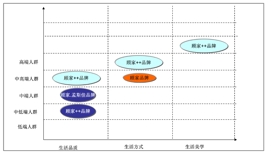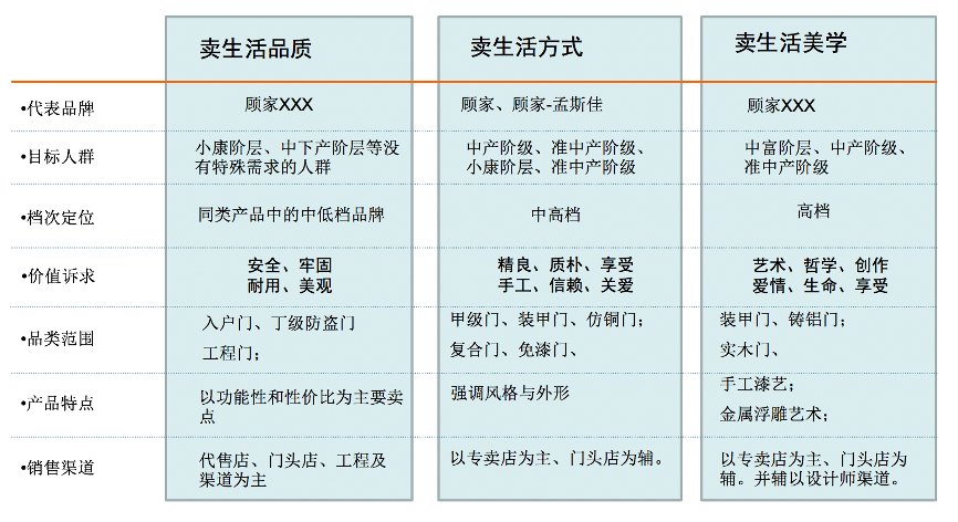 圍繞三大層級將通過不同的定位和訴求實現顧家門業品牌的區隔,達到對目標人群的覆蓋。