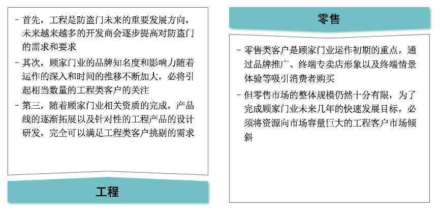 顧家門業渠道策略總原則應是零售渠道以總經銷制為主,兼顧工程渠道,但隨著顧家門業運作的不斷深入和品牌影響力不斷加大,并逐漸向工程類客戶傾斜。