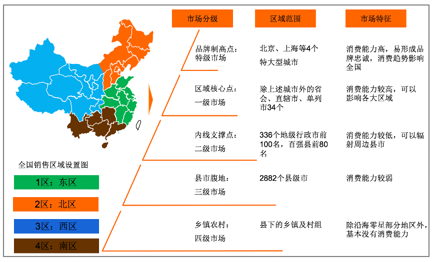 顧家門業按照行政區域設置四個大區,并根據全國區域市場分級及其市場設置總市場布局如下:“一線城市全部占領、二線城市全面覆蓋、三四城市保證可見”。