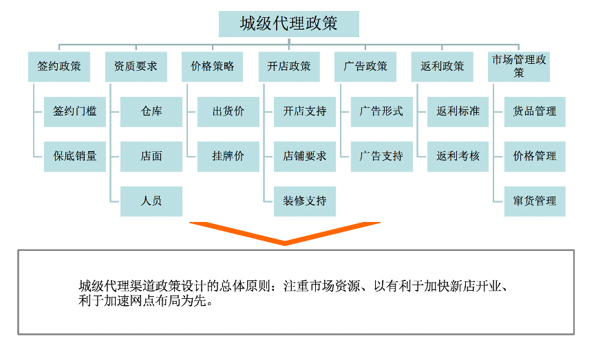 省級代理渠道政策的重點:第一、激發省級代理的銷售激情;二是渠道拓展及維護,空白市場的拓展和現有市場的強化;三是圍繞門店數量快速增加進行專賣店建設,快速有效地實現目標市場覆蓋。