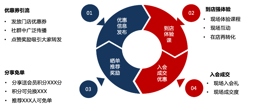 “優(yōu)惠券引流→到店強(qiáng)體驗(yàn)→分享免單→入會(huì)成交”,一氣呵成,塑造“流程式門店體驗(yàn)”。以優(yōu)惠券吸引用戶,以到店體驗(yàn)課、現(xiàn)場互動(dòng)等強(qiáng)化“到店體驗(yàn)”,以會(huì)員積分、曬單推薦等激發(fā)推薦獎(jiǎng)勵(lì),更以“入會(huì)禮”等促進(jìn)高入會(huì)成交,打造“流程式門店體驗(yàn)”,讓體驗(yàn)更給力、更有價(jià)值。