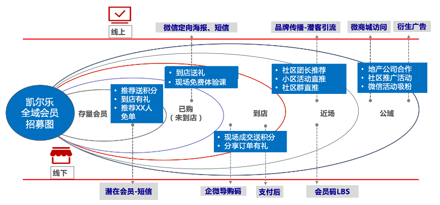 凱爾樂教育O2O,其會(huì)員招募是“全渠道推進(jìn)”的,從線上線下全方位推進(jìn)“會(huì)員招募”,積極擴(kuò)大會(huì)員招募渠道,以送積分等激活“存量會(huì)員”,以“到店送禮”等激發(fā)已購用戶到店,以“企微導(dǎo)購碼”、“支付后優(yōu)惠活動(dòng)”等激活會(huì)員到店,更以會(huì)員碼LBS服務(wù)、公域引流等創(chuàng)造“全渠道會(huì)員價(jià)值”,到店、到場,之后大規(guī)模招募。