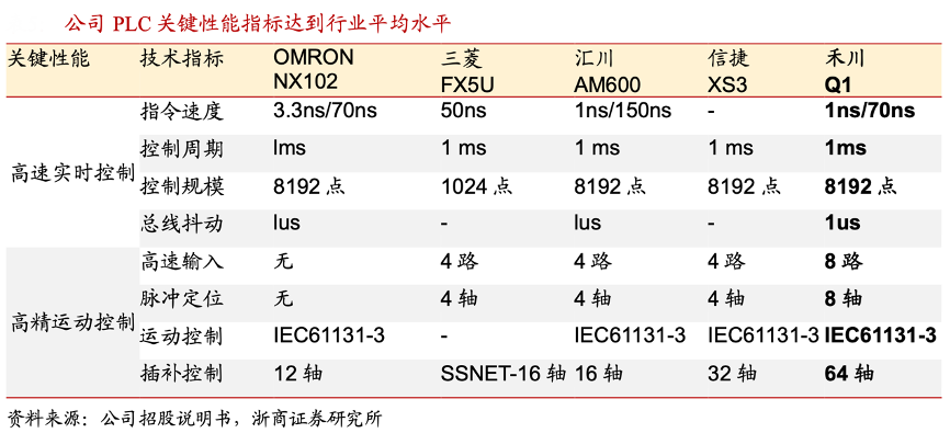 經典案例:根據公司招股說明書、浙商證券研究所等綜合資訊表明,禾川科技在高性能實時控制能力上,其產品總體達到國外主流廠商的技術水平;高精運動控制上,公司已達到或超過內外資同類產品;現場總線控制能力上,公司的 PLC 產品支持 ETHERCAT、OPCUA、ETHERNET/IP、 CANOPEN、MODBUS 等多種總線控制,適配范圍較廣;安全保護能力上,在常規程序保護和功能塊保護的基礎上增加了安全算法功能,可以進一步有效防止信息泄露。