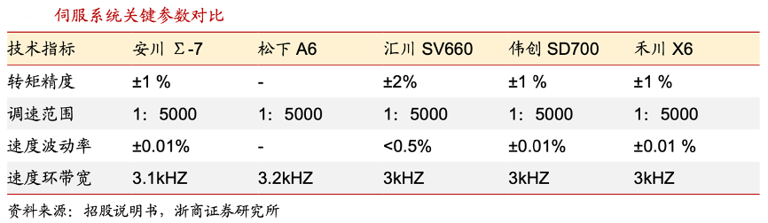 經典案例:根據招股說明書、浙商證券研究所等綜合資訊表明,禾川科技公司的伺服驅動器搭載自主研發的編碼 器,在轉矩精度、速度波動率、速度環帶寬、控制周期等性能參數方面整體上已接近國外主流品牌同類可比產品水準,并可以配合多種總線控制,擁有自調整、模型跟蹤、制振等功能,大幅提高產品易用性的同時可以有效抗擾動并保持運行穩定。