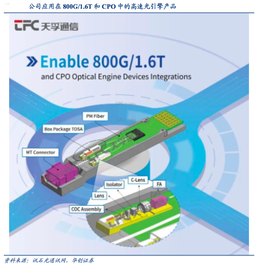 經(jīng)典案例:根據(jù)訊石光通訊網(wǎng)、華創(chuàng)證券等綜合資訊表明,天孚通信公司光引擎項(xiàng)目在 2021 年獲得海外客戶首個(gè)億元訂單,并自 2022 年開(kāi)始為客戶批量交付光引擎產(chǎn)品,目前量產(chǎn)產(chǎn)品已處于穩(wěn)定批量交付狀態(tài)。
