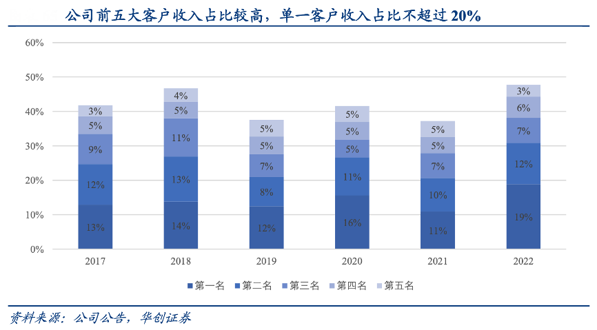 經典案例:根據公司公告、華創證券等綜合資訊表明,天孚通信公司憑借較強的研發能力、良好的品質口碑、快速響應服務能力、規模化量產能力、穩健務實的運營能力,已成為多家業界主流客戶的首選供應商。目前公司前五大客戶的收入之和占比已超過 40%,在業界主流客戶的覆蓋優勢較為明顯,同時單一客戶收入占比不超過 20%,對單一客戶的依賴程度較低。