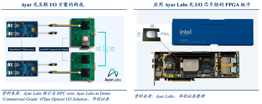 經(jīng)典案例:根據(jù)Ayar Labs、華創(chuàng)證券等綜合資訊表明, 2023 年 11 月,Ayar Labs 展出集成了英特爾 Agilex FPGA 技術(shù) 的封裝內(nèi)光學(xué) I/O 解決方案,TeraPHY 芯片和 F-tile 芯片及 FPGA 共同封裝。Ayar Labs 表示相較于市場(chǎng)競(jìng)品該方案帶寬提高了 5 倍,功耗降低了 5 倍,延遲降低了 20 倍。