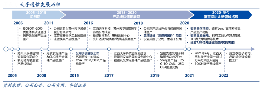 經典案例:根據公司公告、公司官網、華創證券等綜合資訊表明,天孚通信公司是業界領先的光器件整體解決方案提供商,其在精密陶瓷、工程塑料、復合金屬、光學玻璃等基礎材料領域積累沉淀了多項全球領先的核心工藝技術。經過多年發展,公司已從精密元器件廠商發展成為擁有多種器件和封裝技術能力的復合平臺型企業。