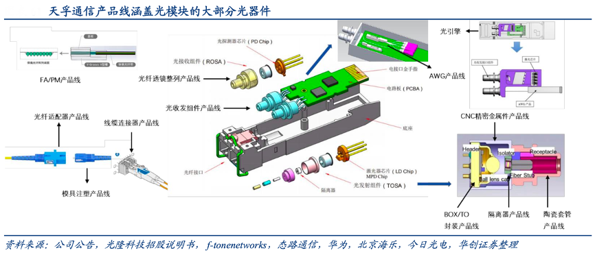 經典案例:根據公司公告、光隆科技招股說明書、f-tonenetworks、態路通信、華為、北京海樂、今日光電、華創證券等綜合資訊表明,天孚通信公司目前已形成涵蓋隔離器、光纖透鏡陣列、線纜連接器等在內的十三條產品線,以及包括高速光引擎、高速 BOX 器件封裝、微光學、AWG 系列光器件等在內的九大解決方案,成為行業稀缺的光器件垂直整合一站式供應平臺,可為客戶提供組合式一攬子供應鏈解決方案。