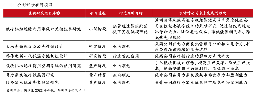 經典案例:根據英維克2022年年報、西部證券研發中心等綜合資訊表明,在研發方面,英維克公司深圳和北京均成立了技術研究院,專注負責產品、技術研發。深圳研究院更注重產品線研究,緊扣公司業務,分別展開了先進熱管理等五個專業方向的技術研究工作,與公司產品線互動。北京研究院則是公司技術研究院的前沿,利用本地充裕科研人才和配套資源,積極參與業務相關先進技術的研發。