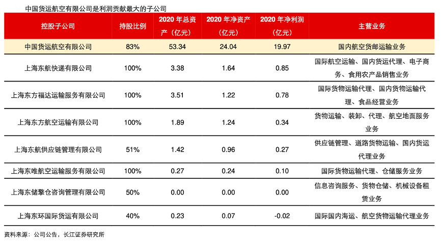 經(jīng)典案例:根據(jù)公司公告、長江證券研究所等綜合資訊表明,東航物流公司是以航空貨運為主的綜合物流企業(yè),致力于搭建多元化的泛航空物流產(chǎn)品服務(wù)體系。其中,中貨航是東航物流旗下盈利最高的子公司,公司的股權(quán)比例為83%,通過全貨機和客機腹艙結(jié)合的方式運營航空速運業(yè)務(wù),獨家承包經(jīng)營中國東航客機腹艙業(yè)務(wù)。