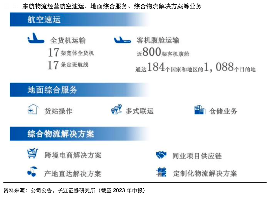 經(jīng)典案例:根據(jù)公司公告、長江證券研究所等綜合資訊表明,東航物流公司依托全貨機與客機腹艙運輸兩種方式為客戶提供覆蓋國際國內(nèi)主要航線網(wǎng)絡(luò)的航空貨運干線運輸服務(wù)。截至 2023H1,公司擁有 17 架自有全貨機 和近 800 架客機腹艙,可通達全球 184 個國家和1088 個目的地。
