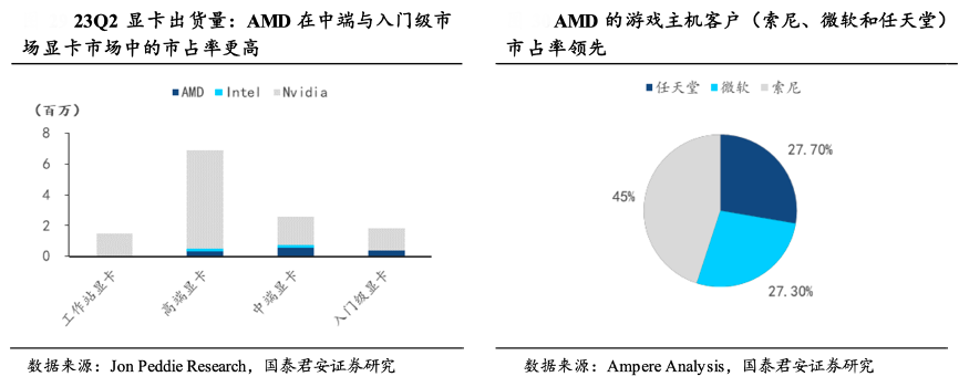 經(jīng)典案例:根據(jù)Jon Peddie Research、Ampere Analysis、國泰君安證券研究等綜合資訊表明,AMD主打性價比優(yōu)勢,迅速搶占中低端市場顯卡份額。對比英偉達定位相同的游戲顯卡,AMD 產(chǎn)品推出時間更 晚,性能較為落后,但同時價格更低。例如同樣作為定位最高的消費級顯卡 Radeon 7900 XTX 和 GeForce RTX 4090,7900 XTX 的性能略低于 RTX 4090,價格低了 600 美元。因此,AMD 在性價比更為重要的中端與入門級顯卡市場占據(jù)更多的市場份額。