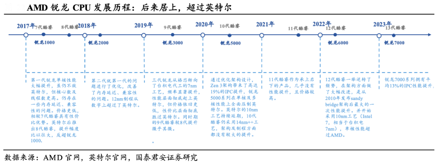 經(jīng)典案例:根據(jù)AMD官網(wǎng)、英特爾官網(wǎng)、國泰君安證券研究等綜合資訊表明,AMD以全新架構(gòu)+制程優(yōu)勢+Chiplet 技術(shù)帶動 CPU 性能提升,通過高性能 +高性價比后來居上。相較于 Intel處理器優(yōu)化的單核性能和較高的時鐘頻率,AMD CPU則以其多核心設(shè)計和高頻率性能在多線程任務(wù)上表現(xiàn)出色,尤其擅長運行視頻編輯、3D渲染和大型數(shù)據(jù)處理等高強度應(yīng)用。