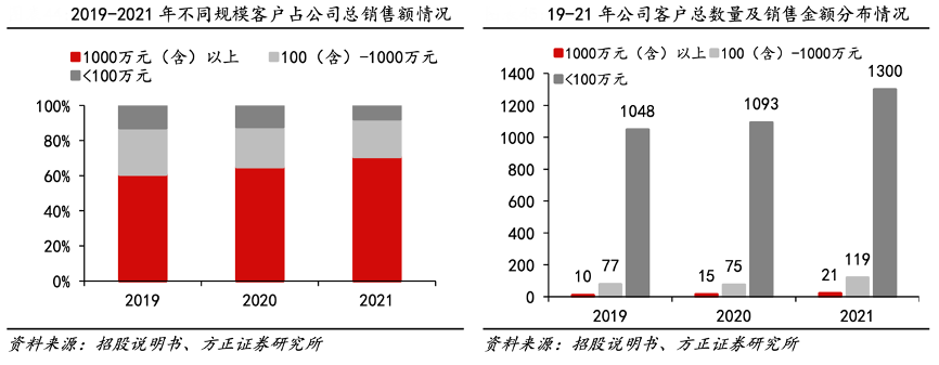 經(jīng)典案例:根據(jù)招股說明書、方正證券研究所等綜合資訊表明,從寶立食品客戶擴(kuò)展數(shù)量來看,其大客戶(年銷售額 1000 萬元及以上)年均拓展 5.5 家,大客戶數(shù)量呈逐年上升趨勢(shì),主要系公司基于對(duì)大客戶的服務(wù)能力及行業(yè)口碑,不斷拓展優(yōu)質(zhì)客戶的結(jié)果。該部分客戶銷售金額合計(jì)占公司主營業(yè)務(wù)收入的比例較高,各期均超過60%,集中度較高。