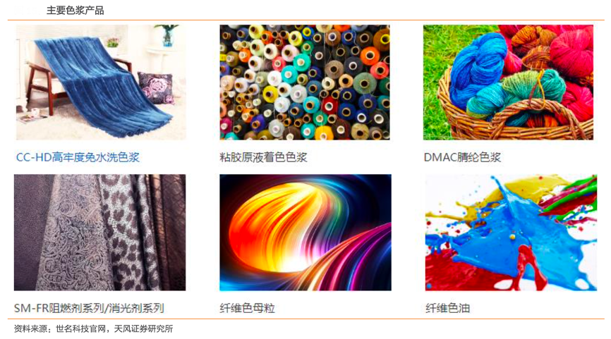 經(jīng)典案例:根據(jù)世名科技官網(wǎng)、天風(fēng)證券研究所等綜合資訊表明,2018 年開始,世名科技公司在持續(xù)優(yōu)化原有涂料類、膠乳著色等產(chǎn)品技術(shù)的基礎(chǔ)上,逐步布局纖維 原液、紡織品綠色著色、特種添加劑等行業(yè)新產(chǎn)品。目前,纖維類產(chǎn)品主要包含纖維原液著色色漿、高性能母粒及功能性納米材料等產(chǎn)品,主要應(yīng)用于紡織纖維領(lǐng)域,基本實(shí)現(xiàn)了纖維原液著色技術(shù)及相關(guān)產(chǎn)品的全覆蓋。
