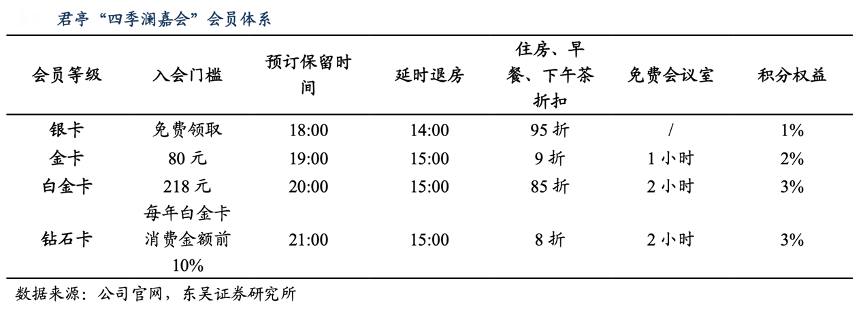 經典案例:根據公司官網、東吳證券研究所等綜合資訊表明,會員體系方面,君亭酒店“四季瀾嘉會”會員體系已基本建成,會員等級分為銀卡、金卡、白金卡以及鉆石卡,在預定、退房以及折扣權益方面給予不同優惠。憑借完善的會員體系,為公司積累大量忠誠客戶,截至 2023 年 11 月,會員總數已達 570 萬。