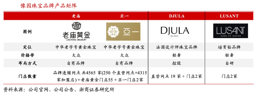經(jīng)典案例:根據(jù)公司官網(wǎng)、公司公告、浙商證券研究所等綜合資訊表明,豫園股份收購+合作+孵化,構(gòu)建多元化品牌矩陣。公司珠寶時尚旗下品牌包括:1)豫園珠寶 時尚集團控股法國珠寶品牌 DJULA,DJULA 定位年輕時尚,以強設計為驅(qū)動,截至 22 年 DJULA 直營網(wǎng)點 19 家。2)前瞻布局成立培育鉆石品牌露璨 LUSANT,并于 22 年開始線 下布局。