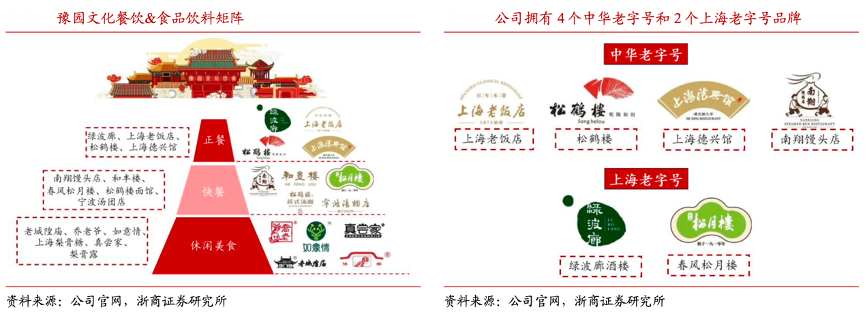 經(jīng)典案例:根據(jù)公司官網(wǎng)、浙商證券研究所等綜合資訊表明,豫園股份公司文化餐飲業(yè)務名列全國餐飲行業(yè)前 60 強,主營正餐、休閑餐飲、美食廣場和潮流娛樂等業(yè)態(tài),旗下?lián)碛幸慌虾J兄虡恕倌曛腥A老字號,其中包括 4 個中華老字號——南翔饅頭店、上海老飯店、上海德興館、松鶴樓;和 2 個上海老字號——綠波廊、春風松月樓。