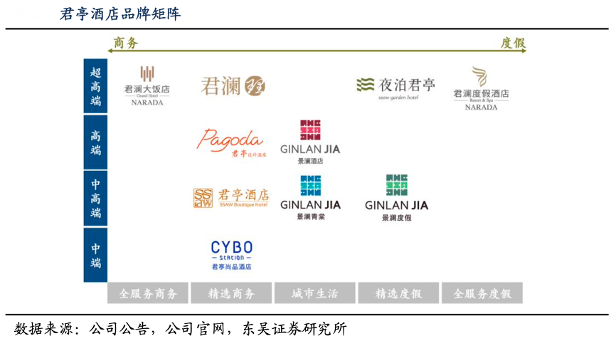 經典案例:根據公司公告、公司官網、東吳證券研究所等綜合資訊表明,君亭品牌誕生于 2007 年,深耕中高端精選服 務酒店行業。截至 2022 年 2 月,君瀾品牌布局浙江、江蘇、海南等超 23 個省市,累計投資 管理超過 180 家酒店,景瀾布局遍及浙江、海南、吉林等 13 個省市,累計投資管理酒 店 75 家。