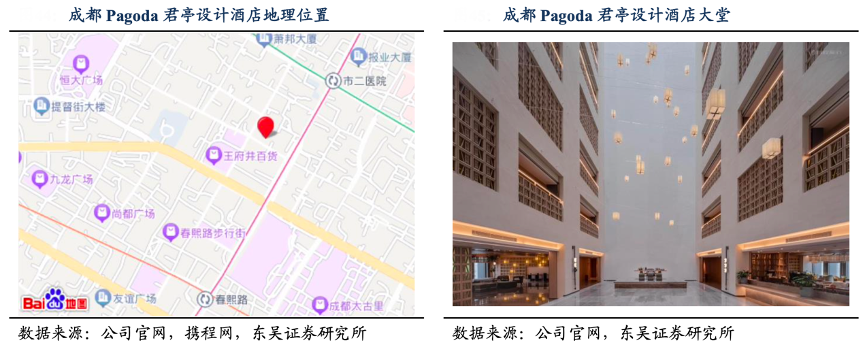 經典案例:根據公司官網、攜程網、東吳證券研究所等綜合資訊表明,成都 Pagoda處于春熙路商圈,距離 成都時尚中心——太古里僅 5 分鐘步程。成都 Pagoda 大堂結合現代 AR 交互技術,展示林俊廷先生作品《鎏瑩》,中庭采用獨特孔明燈設計,營造中式設計氛圍。