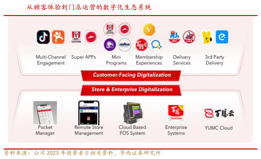 經典案例:根據公司2023年投資者日相關資料、華西證券研究所等綜合資訊表明,自 2016 年以來,公司始終走在數字化和智能化的前沿,持續投資數字化基礎設 施,啟用位于上海、南京、西安三地的數字化研發中心。目前,公司一方面通過超級 APP、小程序、會員體系、外送服務和第三方渠道等構建數字化消費者生態系統,為消費者提供高 品質的服務及消費體驗,推動銷售增長;另一方面通過口袋經理、企業管理系統、百勝云等賦能門店和 企業管理,提高運營和經營決策效率 。