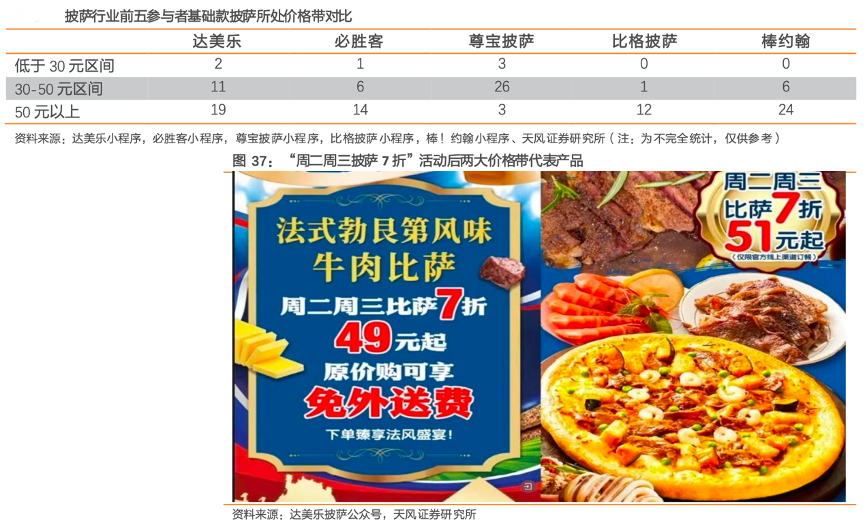 經典案例:根據達美樂小程序、必勝客小程序、尊寶披薩小程序、比格披薩小程序、棒!約翰小程序、達美樂披薩公眾號、天風證券研究所等綜合資訊表明,達美樂公司菜單所提供的披 薩價格低于較多競爭者,據窄門餐眼,達美樂人均單價(57.86 元)低于必勝客(69.88 元)、比格披薩(72.35 元)、棒約翰(60.28 元)。除了提供可接近具有競爭力的低價披薩,達美樂還為追求更優質披薩的顧客提供改變餅底和配料做升級,菜單的多元化讓達美樂能夠向不同收入水平的廣泛顧客提供服務。