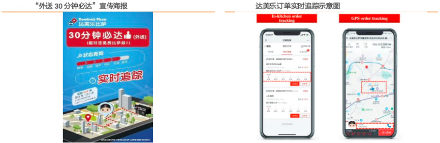 經典案例:根據達美樂官方微博、公司公告、天風證券研究所等綜合資訊表明,結合弗若斯特沙利文報告,達美樂是中國唯一一家在所有銷售渠道提供 30 分鐘必達承諾的披薩公司,在過往記錄期間,達美樂約 90%的外送訂單完成送達承諾,平均訂單完成時間約為 23 分鐘。
