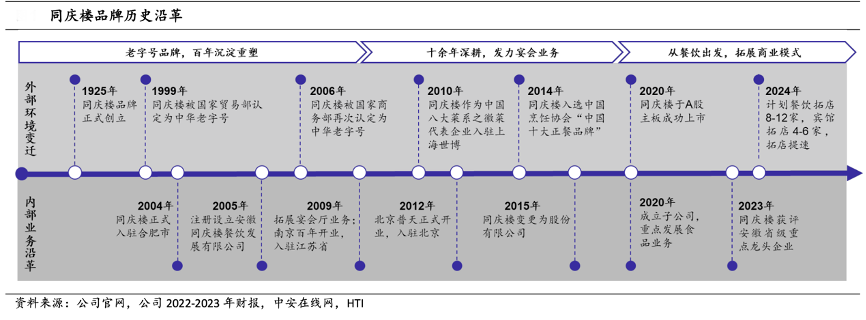經典案例:根據公司官網、公司2022-2023年財報、中安在線網、HTI等綜合資訊表明,同慶樓創始于 1925 年,主打徽菜,擁有百年品牌優勢,并于 2020 年成功上市。公司聚焦大眾餐飲和宴會婚慶服務,也在不斷創新豐富自身業態,目前主營餐飲、賓館和食品三大業務,并設置餐飲事業部、婚禮宴會事業部、賓館事業部、食品事業部和新餐飲事業部五大事業部協同支持業務發展。
