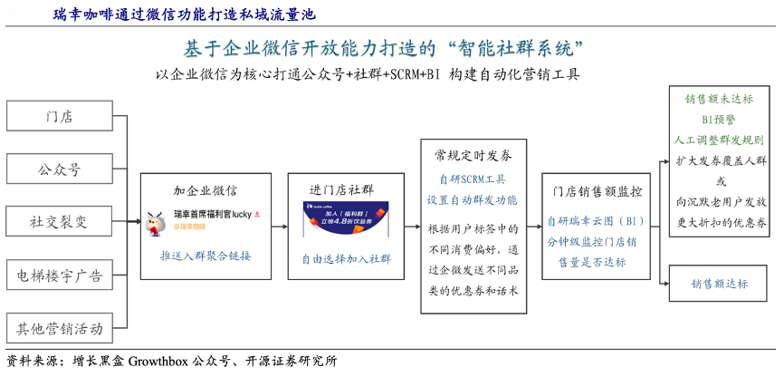 經(jīng)典案例:根據(jù)增長黑盒Growthbox公眾號(hào)、開源證券研究所等綜合資訊表明,隨著消費(fèi)人群增加,瑞幸開始通過大量企業(yè)微信社群構(gòu)建用戶私域流量池,并采用積分、優(yōu)惠券、折扣等獎(jiǎng)勵(lì)機(jī)制,增加用戶的黏性,提高用戶復(fù)購率。