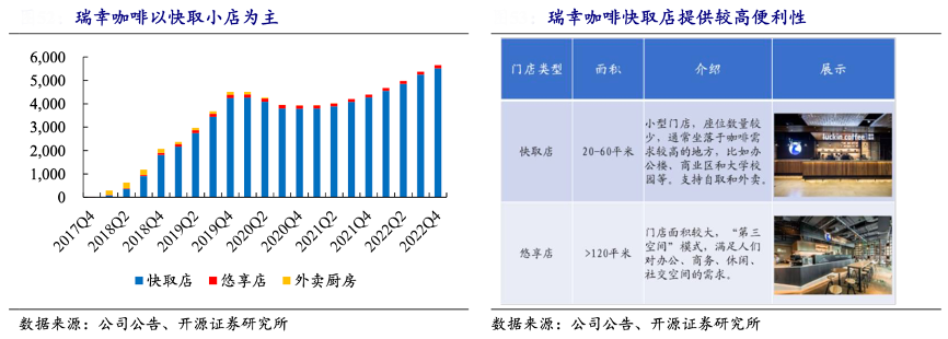 經(jīng)典案例:根據(jù)公司公告、開源證券研究所等綜合資訊表明,瑞幸咖啡門店類型大部分以快取店為主。瑞幸的快取門店集中在咖啡需求量較大的地區(qū),例如寫字樓、商業(yè)區(qū)和大學(xué)校園,同時(shí)門店面積小,大部分在 20-60 平方米之間,定位“快咖啡”消費(fèi)場(chǎng)景。