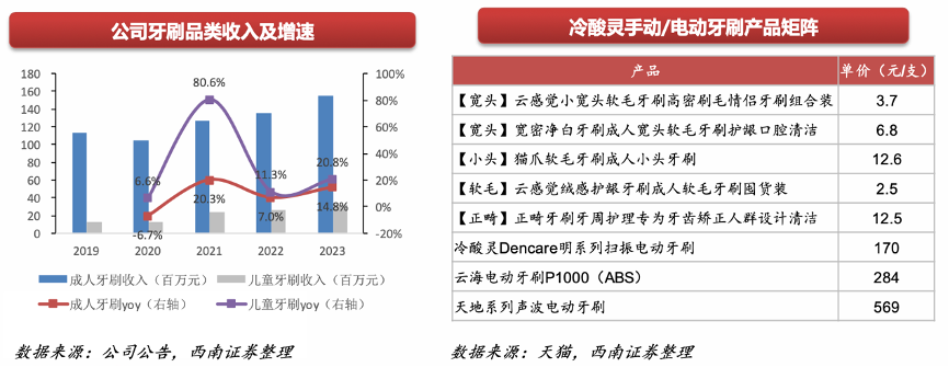 經典案例:根據公司公告、天貓、西南證券等綜合資訊表明,登康口腔公司電動牙刷產品以差異化新技術產品為主,目前主銷款為公司自主研發的掃振技術電動牙刷,為行業主流新技術產品,定價在掃振技術電動牙刷中性價比突出。