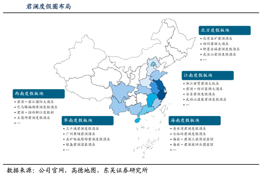 經典案例:根據公司官網、高德地圖、東吳證券研究所等綜合資訊表明,君瀾依托濱海、溫泉、古城古鎮等優質旅游目的地,整合景區和物業資源,打造“四南一北”全國度假圈布局。得益于中式文化融合服務和優質旅游資源整合,君瀾已形成國內規模最大、門類最齊全的大型度假酒店運營商,在新增項目數量、資源性項目占領上具備領先優勢,引領高端度假行業發展。