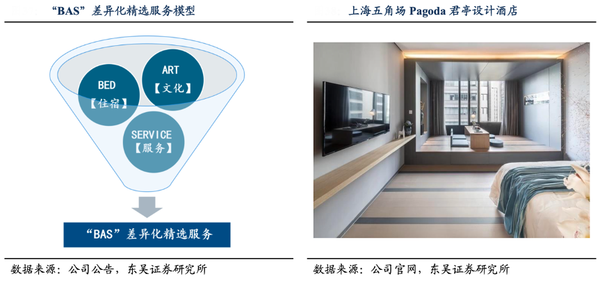 經典案例:根據公司公告、公司官網、東吳證券研究所等綜合資訊表明,君亭首創“BAS”模式,提供差異化精選服務。“BAS”模型即“Bed 住宿+Art 文化 藝術+ Service 服務”三位一體,以產品為基礎,不斷提升品牌及體驗。君亭立足于“BAS” 模式,形成“產品精選、文化精選及服務內容精選”的君亭特色服務體系。