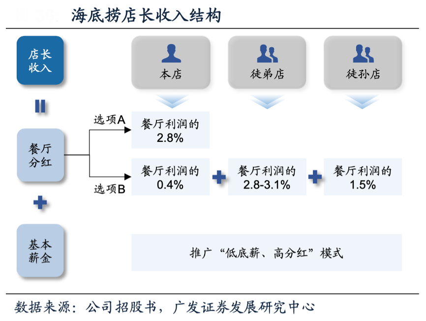 經典案例:根據公司招股書、廣發證券發展研究中心等綜合資訊表明,海底撈“師徒制”深度綁定店長與公司的利益,據公司招股書及財報,主要經營人員采取“低底薪、高分紅”薪酬制度,分紅方面,店長可分享餐廳利潤的2.8%,或者分享餐廳利潤的0.4%+徒弟店利潤的2.8-3.1%+徒孫店利潤的1.5%,從而激勵店長為公司培養人才。