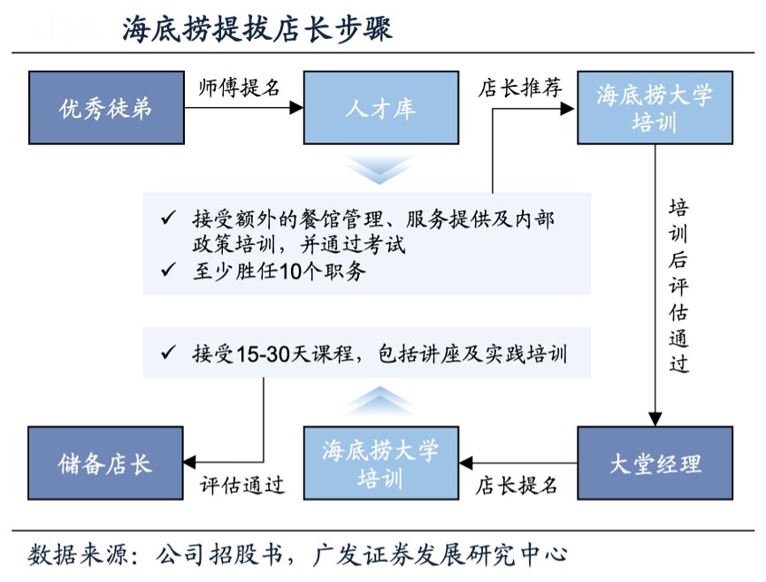 經典案例:根據公司招股書、廣發證券發展研究中心等綜合資訊表明,海底撈公司注重人才培養和儲備,店長可提拔優秀的大堂經理接受海底撈大 學的店長培訓,通過后即可成為儲備店長,待有合適的新餐廳開業時,儲備店長即 可被提拔為店長,員工晉升為店長約需4年。