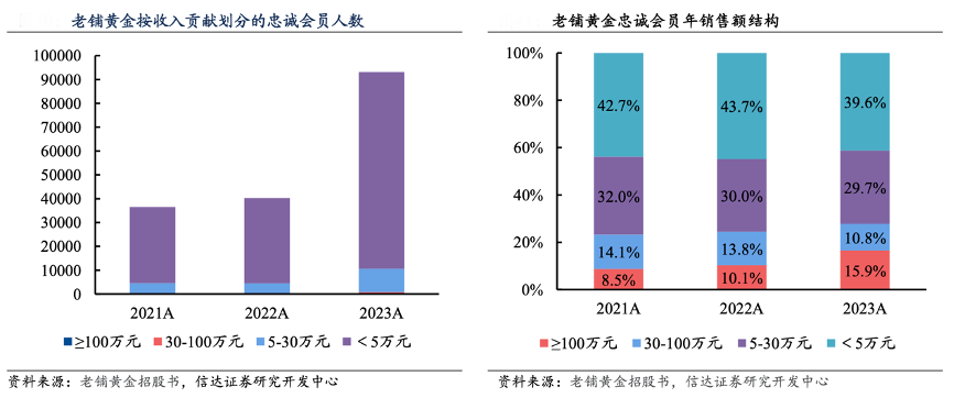 經(jīng)典案例:根據(jù)老鋪黃金招股書、信達證券研究開發(fā)中心等綜合資訊表明,老鋪黃金忠誠會員人數(shù)快速增長,高級別會員銷售貢獻持續(xù)提升。2023 年,在老鋪黃金購買至少一 次的忠誠會員人數(shù)翻倍以上增長,達到 9.3 萬人,同比增幅 131%。其中,年消費額 100 萬 元及以上的忠誠會員貢獻了公司 15.9%的收入。
