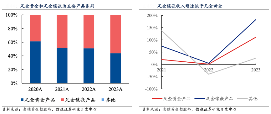 經(jīng)典案例:根據(jù)老鋪黃金招股書、信達證券研究開發(fā)中心等綜合資訊表明,老鋪黃金公司產(chǎn)品主要分為足金黃金和足金鑲嵌兩大類,2023年營收占比分別為 43.9%/56.0%,其中足金鑲嵌品類得益于 2019 年公司首度推出的黃金鑲鉆產(chǎn)品系列表現(xiàn)亮眼,收入占比從 2020 年的 38.5%持續(xù)提升至 2023 年的 56.0%、占比過半。2021-2023 年收入增速持續(xù)快于足金黃金類產(chǎn)品。