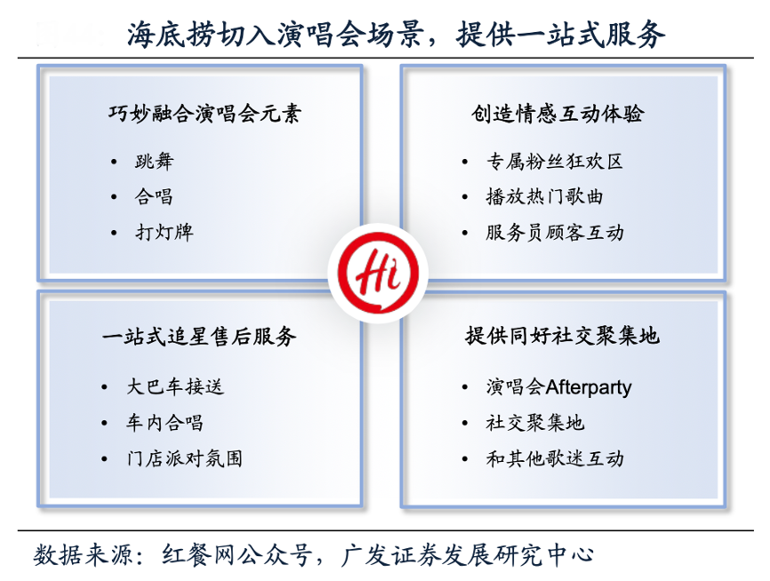 經典案例:根據紅餐網公眾號、廣發證券發展研究中心等綜合資訊表明,2023年演唱會市場火熱,海底撈迅速抓住演唱會后打車難、夜宵少等痛點,提供演唱會現場大巴車接送、車內合唱、門店Afterparty等一站式服務,為消費者提供情緒價值。