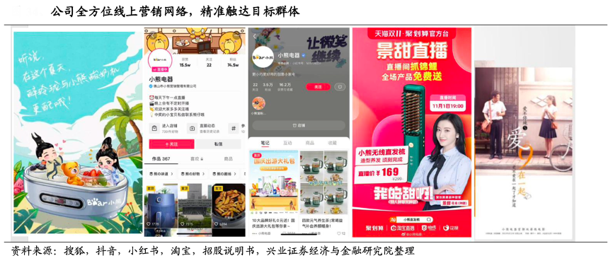 經典案例:根據搜狐、抖音、小紅書、淘寶、招股說明書、興業證券經濟與金融研究院等綜合資訊表明,除傳統的戶外廣告投放、淘系及京東平臺品牌推廣、明星代言外,小熊公司廣泛布局線上營銷網絡,通過影視及綜藝節目植入、新媒體營銷、合作頭部主播等途徑積極推廣,覆蓋小紅書、抖音、微博等 新興主流社媒平臺,緊跟流量發展方向。